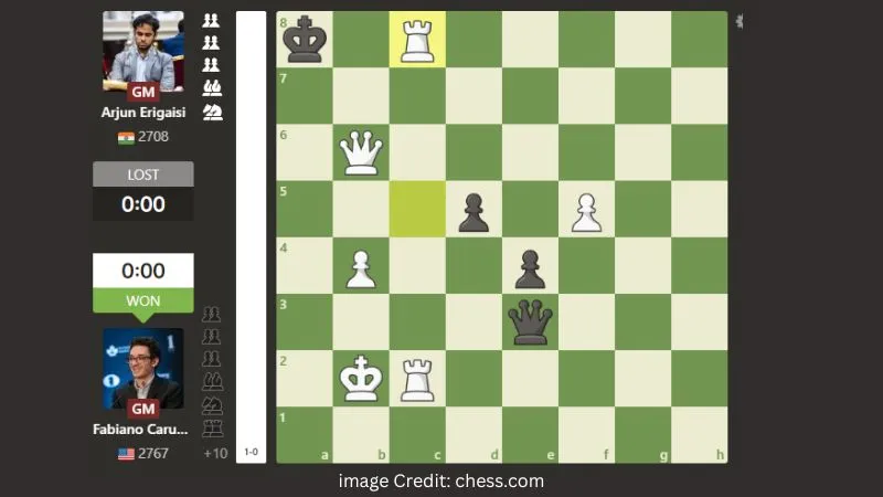 Caruana opened with 1.e4 and played aggressively from the start. Arjun defended well but slipped under time pressure. In a tense rook endgame, Caruana found a brilliant tactic to force checkmate.